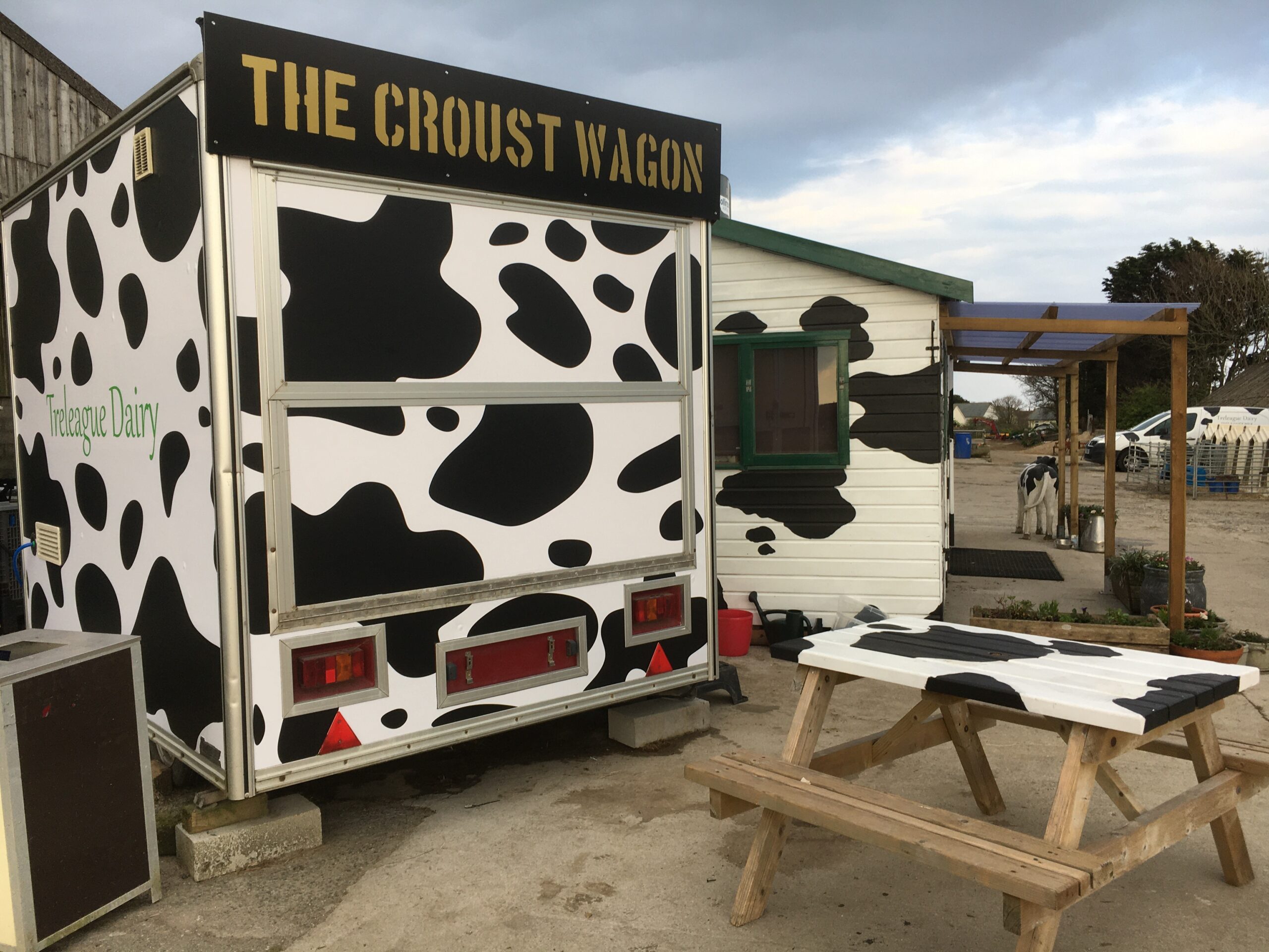 With the loss of our cream tea shed as a fishmongers, we looked around for a catering van to enable us to do hot food. People were not able to travel much or eat out, so we decided to try evening meals and cooked breakfasts. It wasn’t long before it was transformed into the cow-print “Croust Wagon”.
